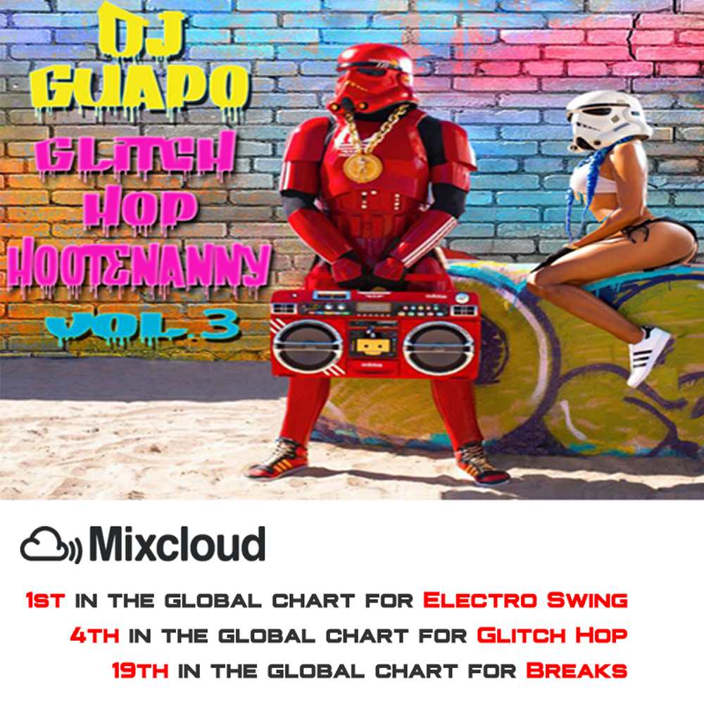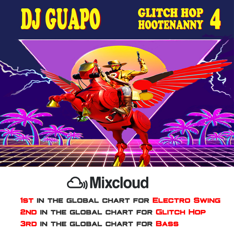 Guapo’S BASS MUSIC sets have made their mark internationally. His series “Glitch Hop Hootenanny” routinely reaches Top 5 in the world on Mixcloud’s Global Charts. He peaked at #1 on the Electro Swing Charts, #2 in Glitch Hop and #3 on the Bass Charts. He is a mad scientist in the laboratory of sample culture, unleashing a tsunami of styles :